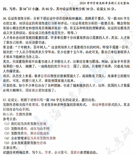 以上就是海天考研网为各位考生整理的2024考研管理类综合能力真题答案解析,持续为考研学子更新考研政治、数学、英语、396考研真题及答案解析等,各位考生可以根据自身需要关注收藏,及时查看完整版2024考研真题及答案解析。